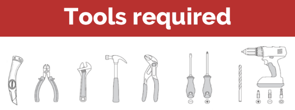 Basic hand tools are required, including a utility knife, pliers, hammer, electrical screwdrivers, adjustable spanners and wrenches together with power tools such as a cordless drill and reciprocating saw.